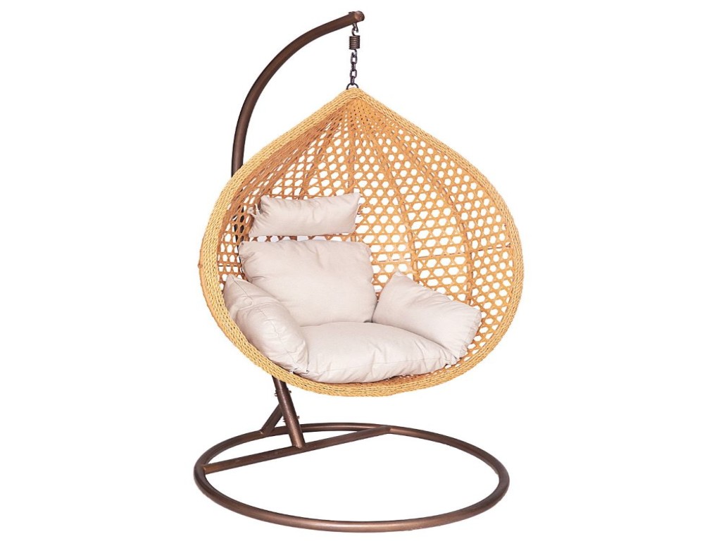 Ljuljaška jaje je viseća stolica sa bež jastukom i braon okvirom.