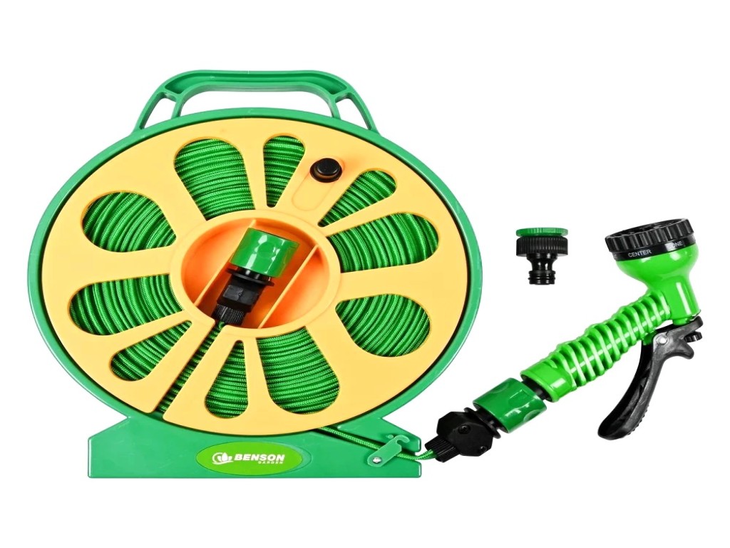 Set uključuje kolut za crevo, adapter za slavinu od 3/4", priključak za mlaznicu za prskanje od 1/2" i mlaznicu za prskanje sa ne manje od sedam različitih postavki.