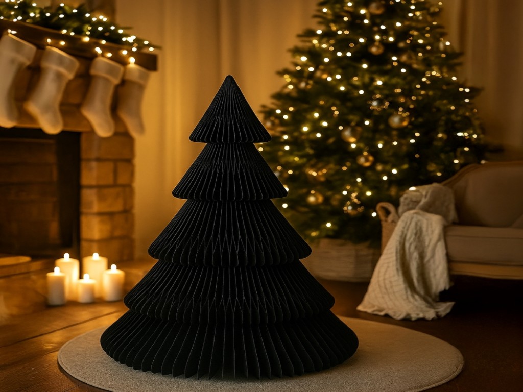 Jelka papirna u crnoj boji. Zanimljiva i atraktivna dekoracija za Novogodišnje i Božićne praznike.