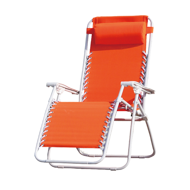 Ležaljka za baštu u narandžastoj boji sa jastukom za naslon glave. Plastični podesivi rukohvati i prijatan tekstil.