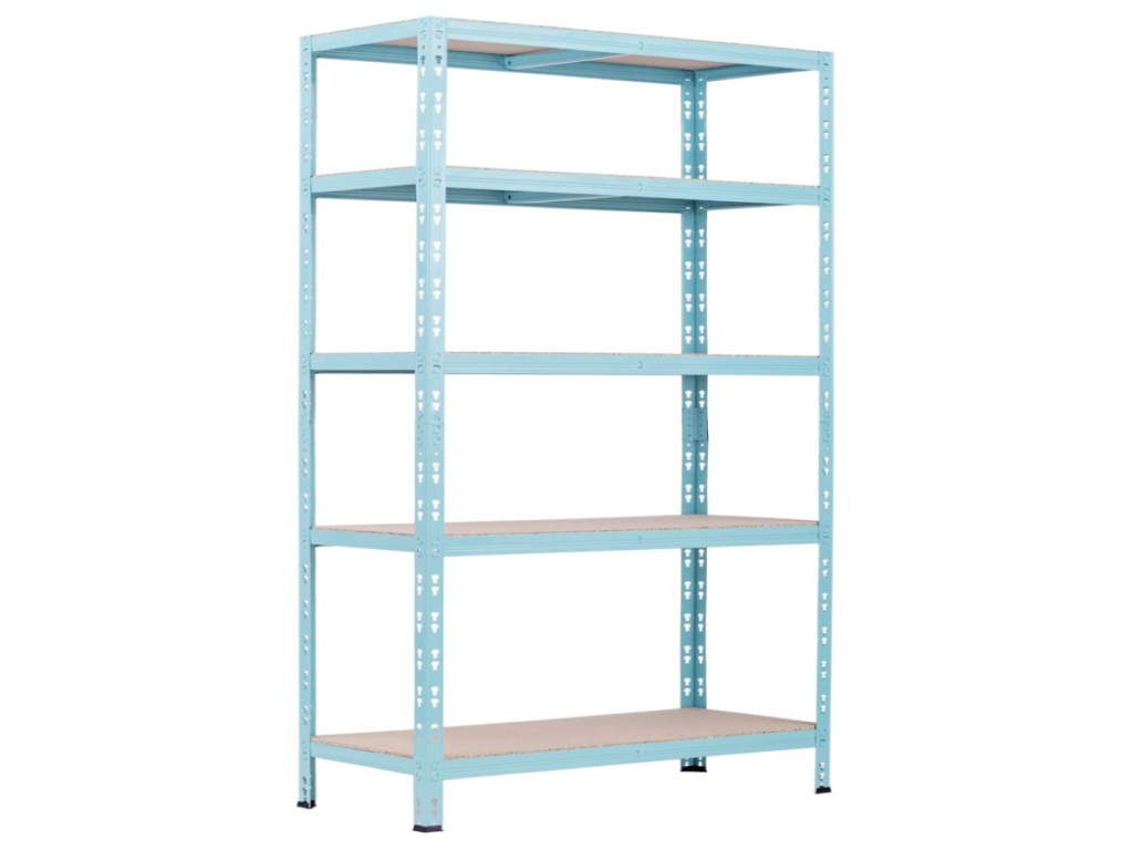 Polica metalna u plavoj boji sa 5 nivoa MDF polica.