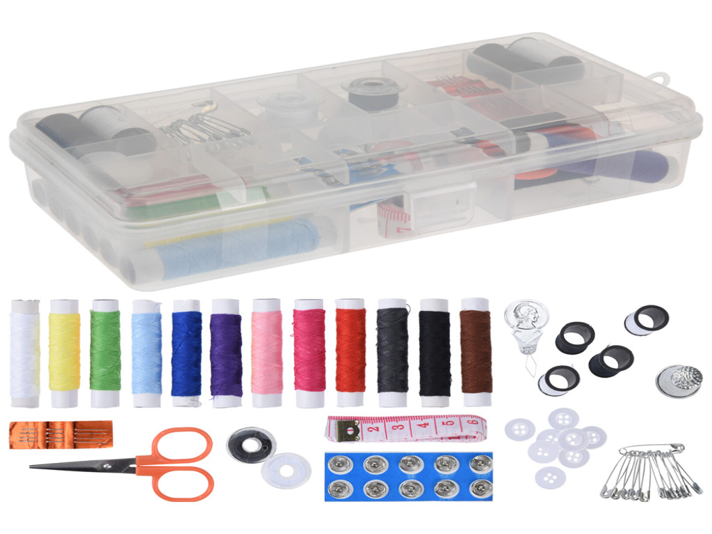 Komplet uključuje igle, konce u različitim bojama, makazice, dugmad i druge osnovne dodatke potrebne za šivenje. Svi elementi su organizovani u praktičnoj kutiji koja omogućava pregledno čuvanje i lak pristup priboru.