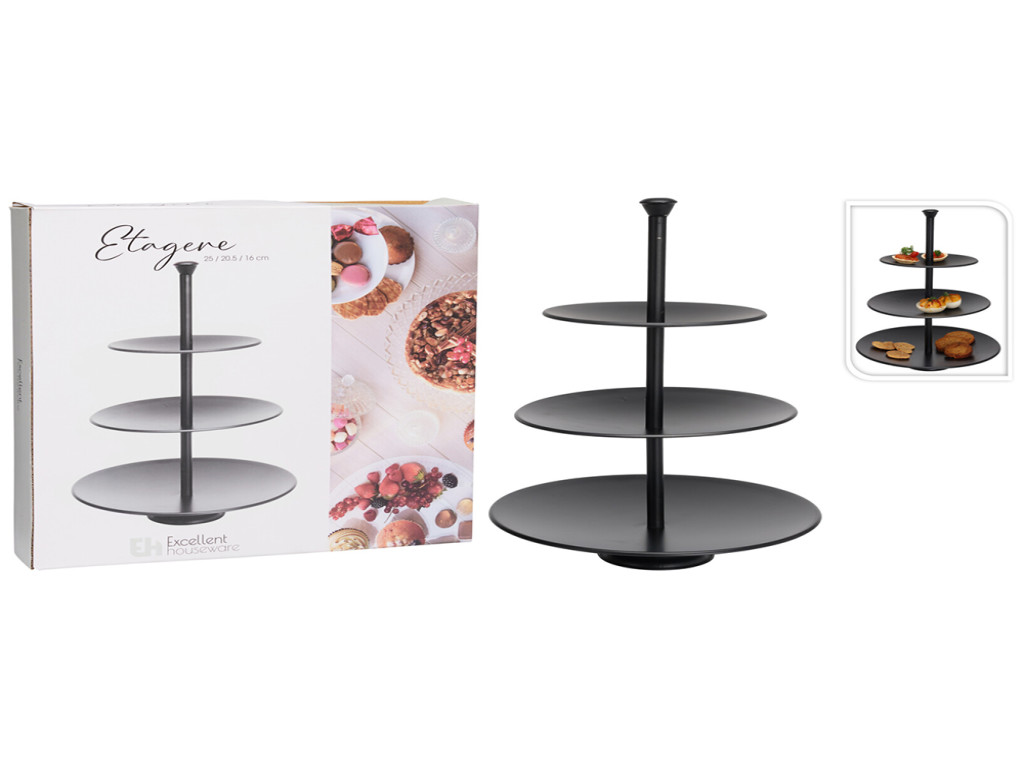 STALAK ZA KOLAČE 3 NIVOA MAT CRNI KOOPMAN osmišljen je za atraktivno i pregledno posluživanje kolača, mafina, tortica, voća ili slanih zalogaja. Tri nivoa omogućavaju optimalno iskorišćenje prostora na stolu, dok istovremeno pružaju dekorativni efekat prilikom serviranja.