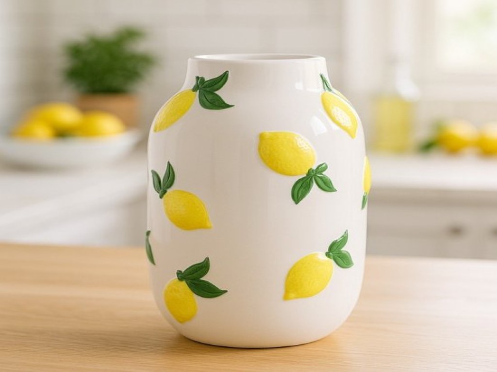 Koopman vaza sa motivom limuna predstavlja atraktivan dekorativni element koji unosi vedrinu i živopisne detalje u enterijer. Dizajn inspirisan mediteranskim stilom sa citrusnim motivima čini je idealnim izborom za osveženje prostora, bilo da se koristi samostalno ili sa cvećem.