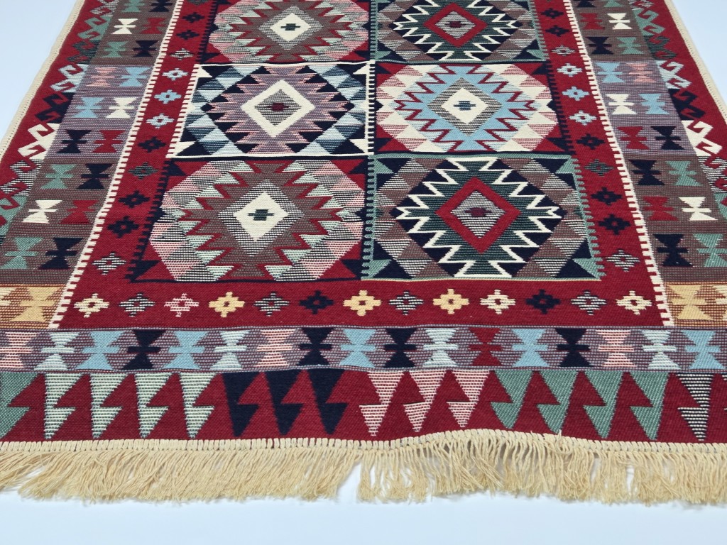 Staza ćilim dimenzija 120x180 cm u dezenu 001 predstavlja upečatljiv dekorativni element inspirisan tradicionalnim etno motivima. Kombinacija geometrijskih šara i toplih tonova (crvena, plava, bež) unosi živost i autentičan izgled u svaki prostor.