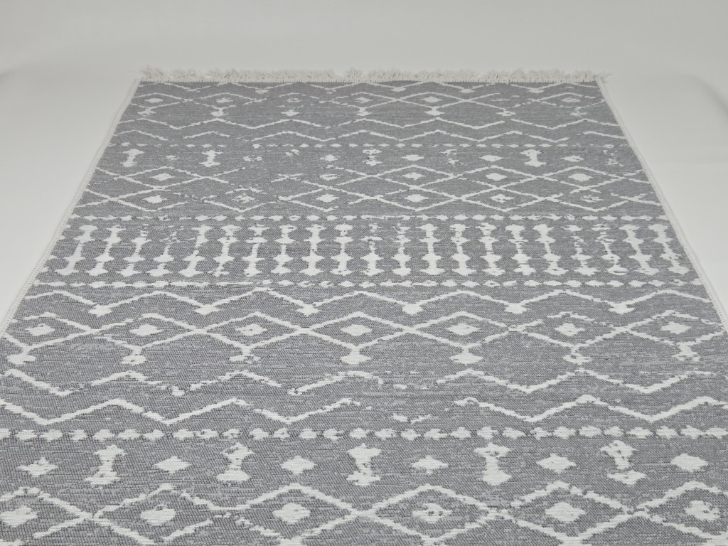 Staza ćilim dimenzija 120x180 cm u dezenu 003 odlikuje se elegantnim i smirenim dizajnom u kombinaciji sive i bele boje. Diskretni geometrijski i etno motivi čine je idealnim izborom za enterijere koji teže minimalističkom ili skandinavskom stilu.