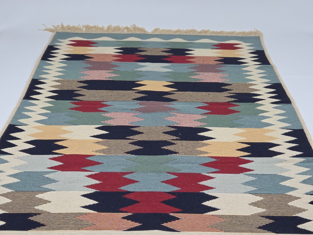 Staza ćilim dimenzija 120x180 cm u dezenu 004 predstavlja spoj funkcionalnosti i dekorativnog dizajna. Geometrijski motivi daju prostoru dinamiku i stil, dok pažljivo uklopljene boje omogućavaju lako kombinovanje sa različitim nameštajem i dekoracijom.