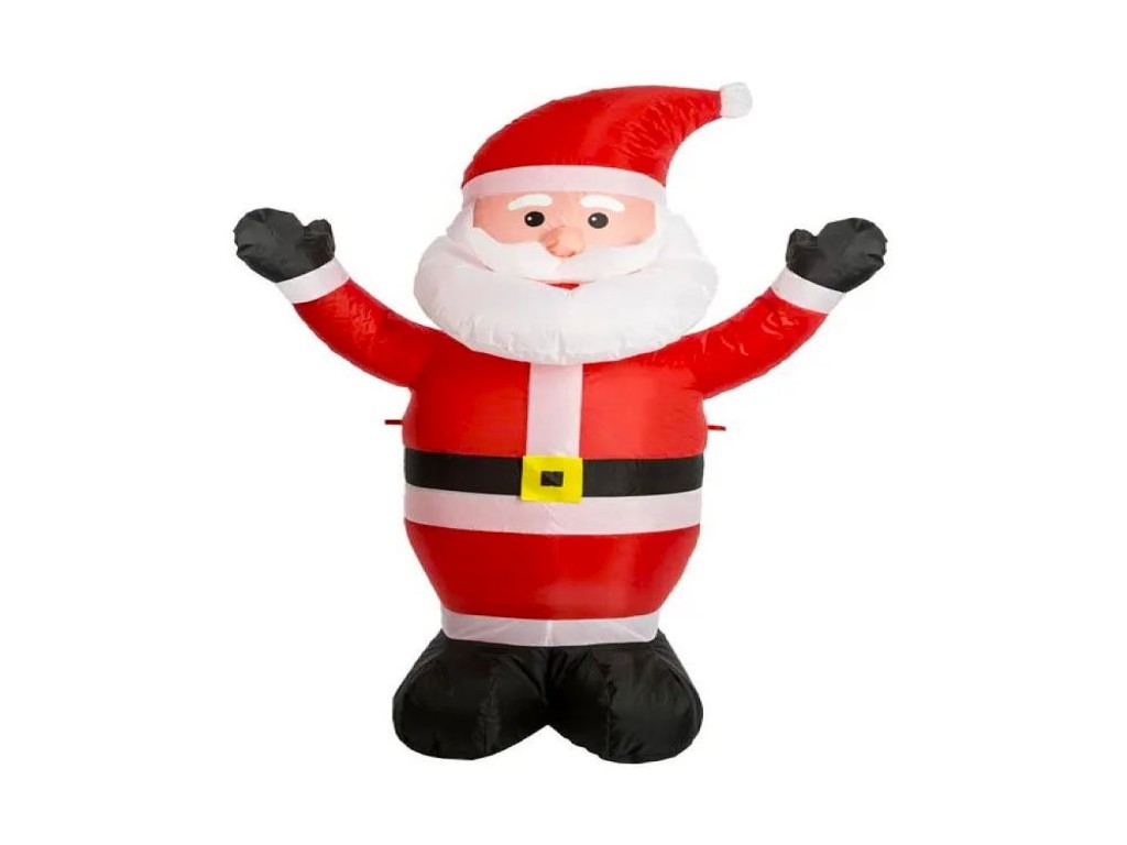 Crveno beli Deda Mraz, visine 120 cm - materijal: poliester - uključuje se u električnu utičnicu za naduvavanje (transformator uključen, IP44 CE standard) - vreme naduvavanja 2 minuta - za unutrašnju i spoljašnju upotrebu