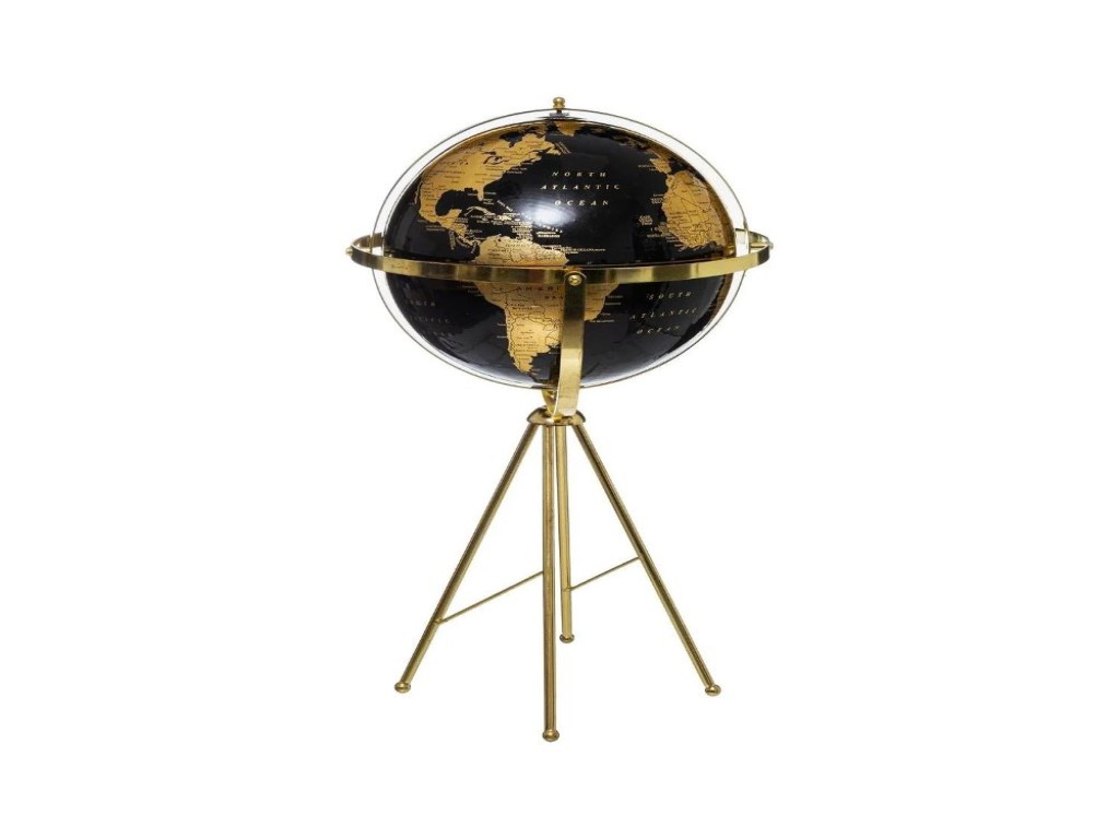 Globus crno/zlatni H60cm. Dekorativni stajaći globus sa zlatnim postoljem, jedinstven, i veoma atraktivan kao ukras u vašem domu, koristan za obnavljanje pozicije kontinenata, i svakako idealan za poklon.