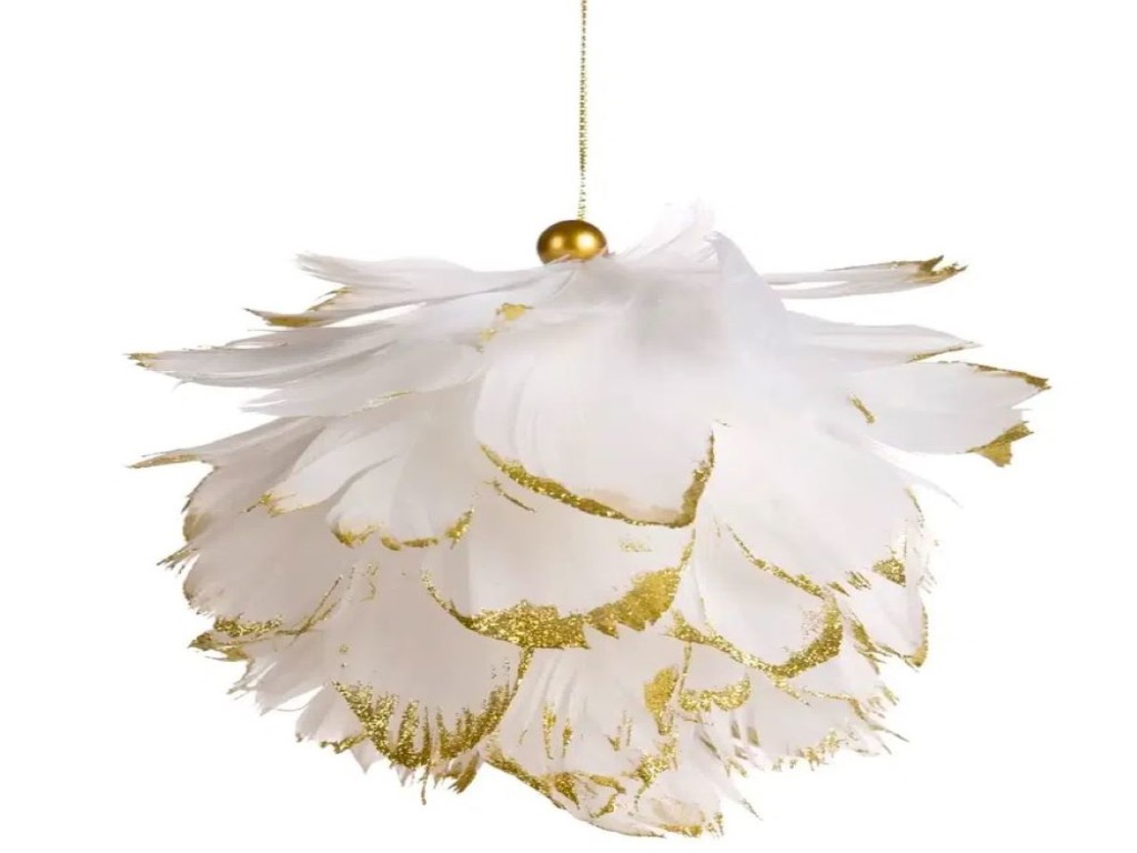 Novogodišnji ukras sa perijem u beloj boji oivičen zlatnim šimerom.