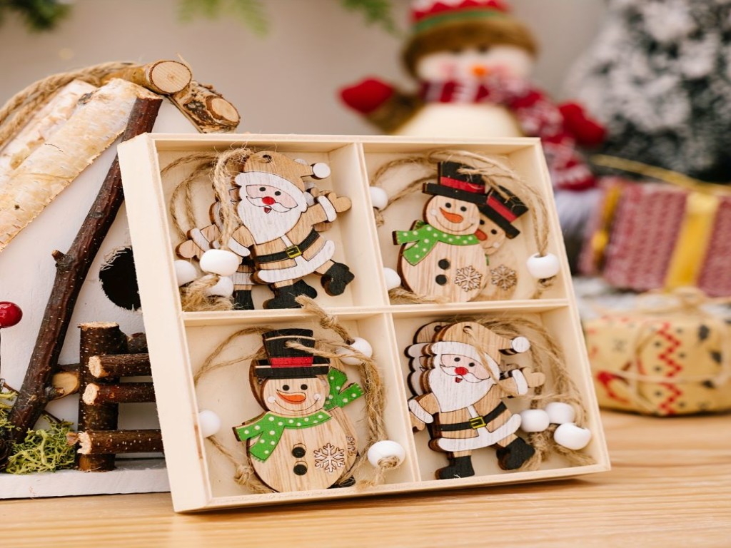 Ukras viseći izradjen od drveta 12 komada. Božićni ukrasi u obliku pahuljica, vile, Deda mraza, Sneška belića je suptilan i elegantan akcenat koji će savršeno upotpuniti svečani aranžman bilo kojeg božićnog drvca.