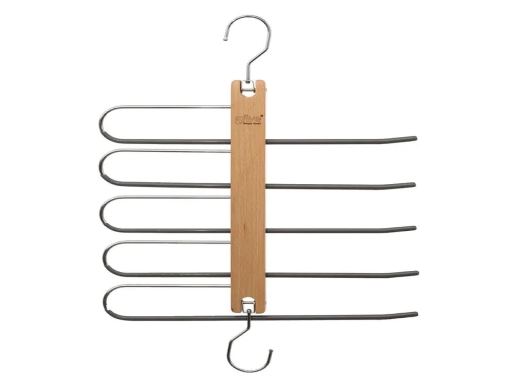 Kombinacija drveta i metala obezbeđuje čvrstoću i stabilnost, dok moderan dizajn omogućava lako uklapanje u različite stilove enterijera. Svaka šipka omogućava sigurno kačenje pantalona bez gužvanja i klizanja, čime se čuva njihov oblik.