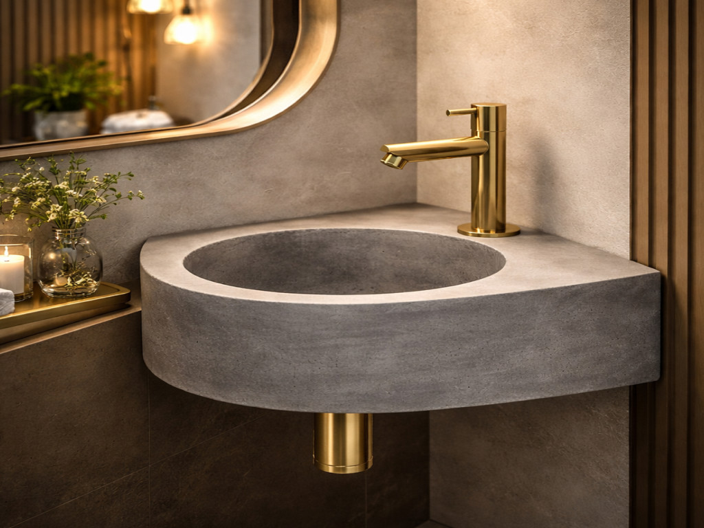 Tamno sivi betonski Cleo umivaonik koji štedi prostor ima otvor za slavinu u uglu, što ga čini pogodnim za ugradnju u ugao. Beton je ojačan fiberglasom i ima vodootporni premaz. Beton stvara industrijski izgled i nadopunjuje razne dostupne boje slavina, odvodnih čepova i sifona. Očistite lavabo mekom krpom i prirodnim proizvodom. Ne koristite hemikalije, kisele proizvode ili rastvarače za čišćenje površine. Ako površini treba dugo da se suši nakon čišćenja, to ukazuje na to da ju je potrebno ponovo tretirati cementnim zaptivačem kako bi se održala njena trajnost